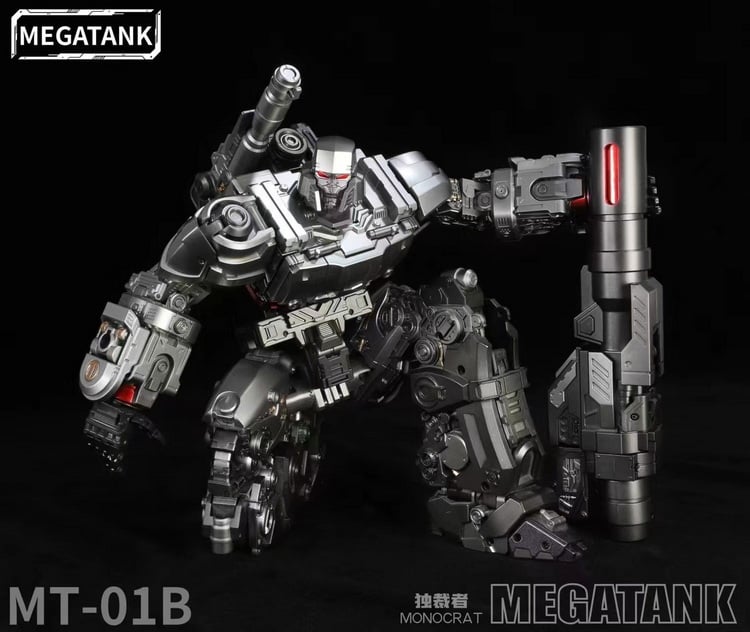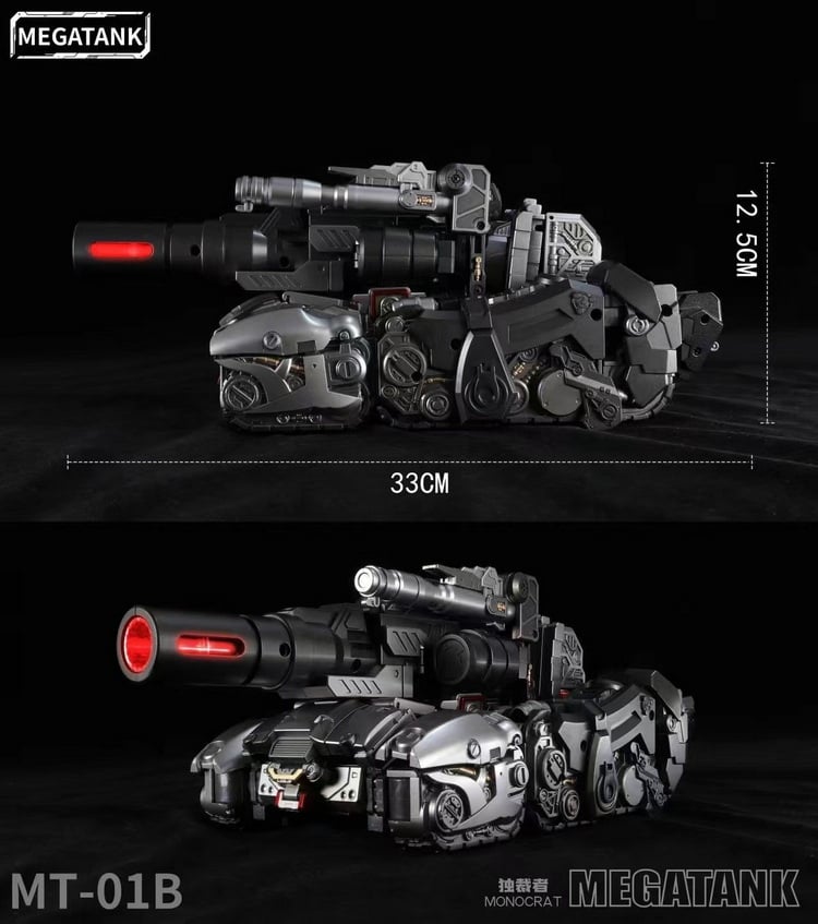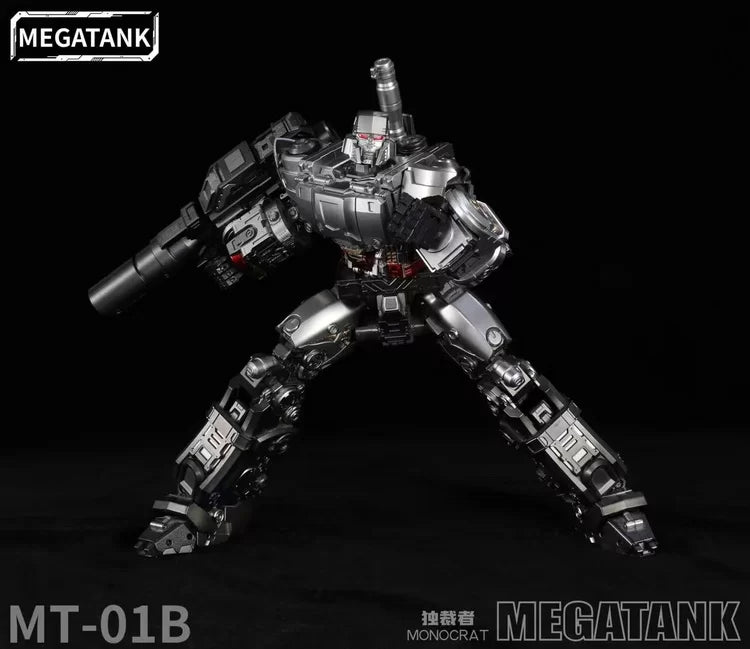 Monocrat MT-01B Megatank (Original Ver.) converts from robot to tank and back. Comes with additional accessories and new color way! Does not feature the original "battle damaged" paint, and does not include original release special bonus Giant Sword accessory!