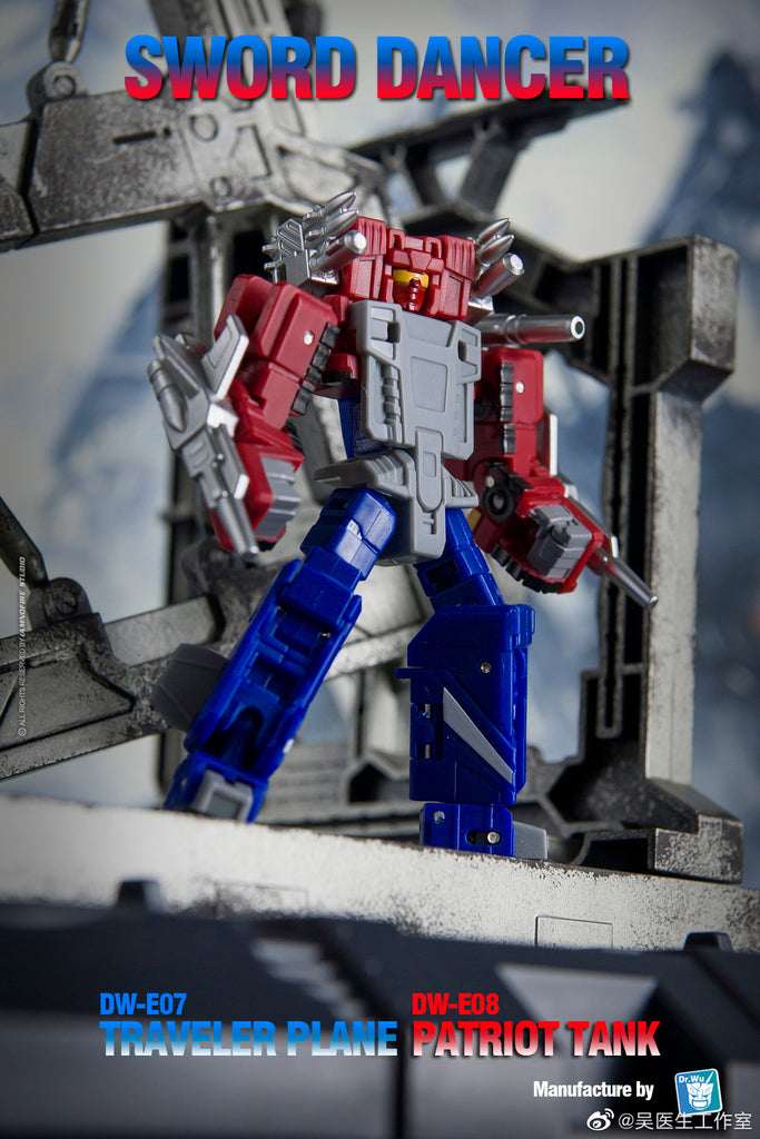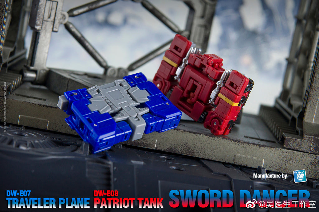 Dr. Wu's DW-E07 Traveler Plane & DW-E08 Patriot Tank (TOY COLOR Ver.) transform from vehicle warriors to cassette modes and back for chug-scaled robot action, includes additional blasters. Both cassettes also combine to form SWORD DANCER! (Other figures sold separately and are only for display.)
