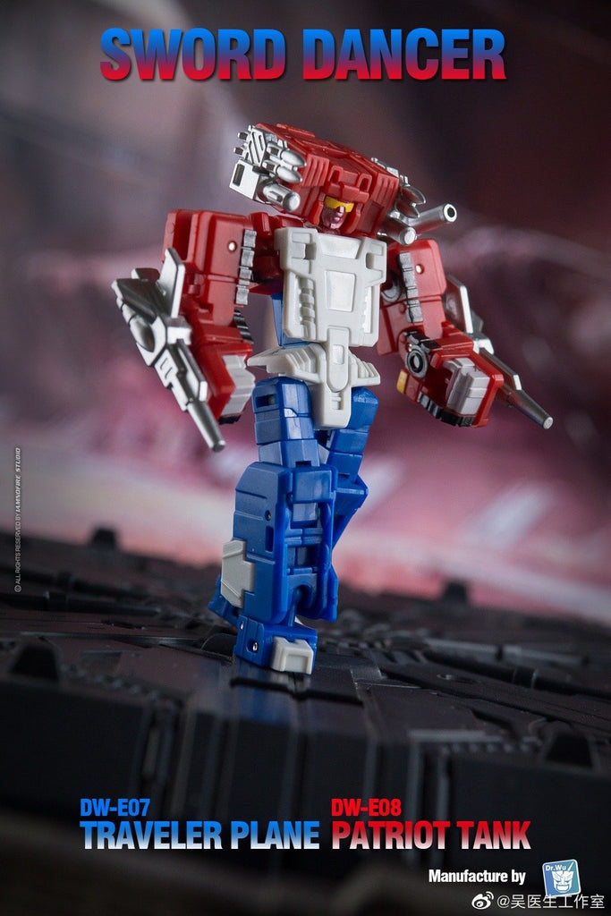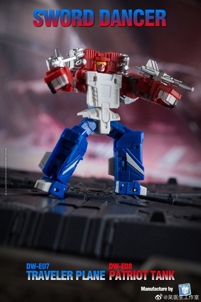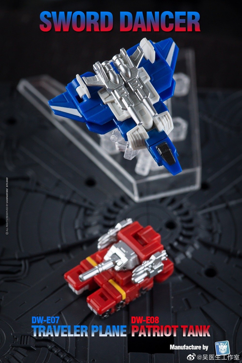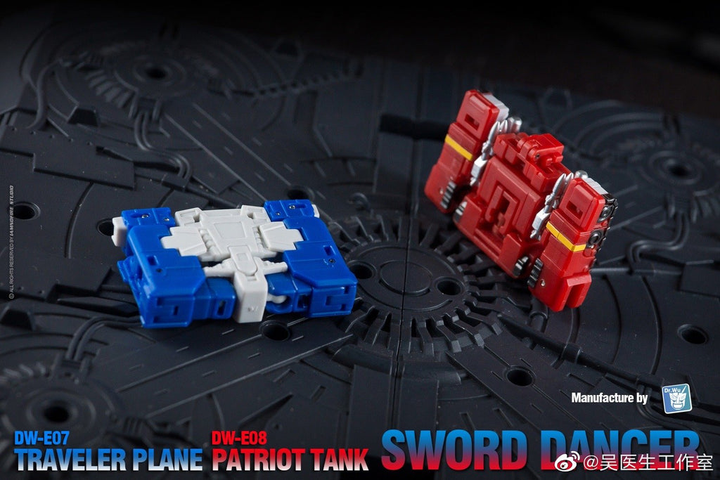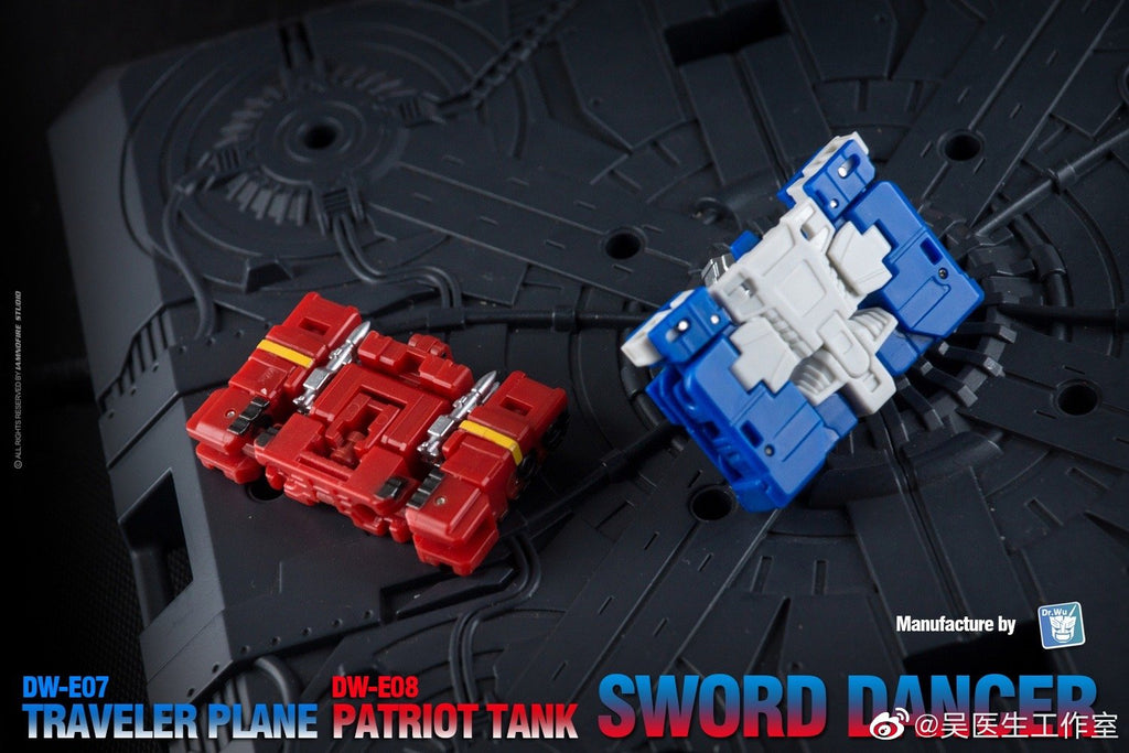 Dr. Wu's DW-E07 Traveler Plane & DW-E08 Patriot Tank transform from vehicle warriors to cassette modes and back for chug-scaled robot action, includes additional blasters. Both cassettes also combine to form SWORD DANCER! (Other figures sold separately and are only for display.)