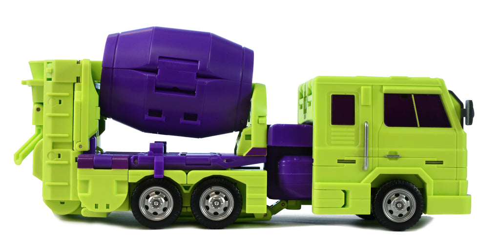 Ocular Max proudly presents R-28 Demolitor, part of the Perfection Series line. Engineered under the ALL BUILT IN design philosophy, Demolitor requires absolutely no additional parts to form Destructor’s left leg, delivering a seamless transformation experience without sacrificing sculpt, articulation, or handling. This triple-changer converts between a robust robot, a realistic cement mixer truck, and a fully functional combiner leg—all using his own integrated components.