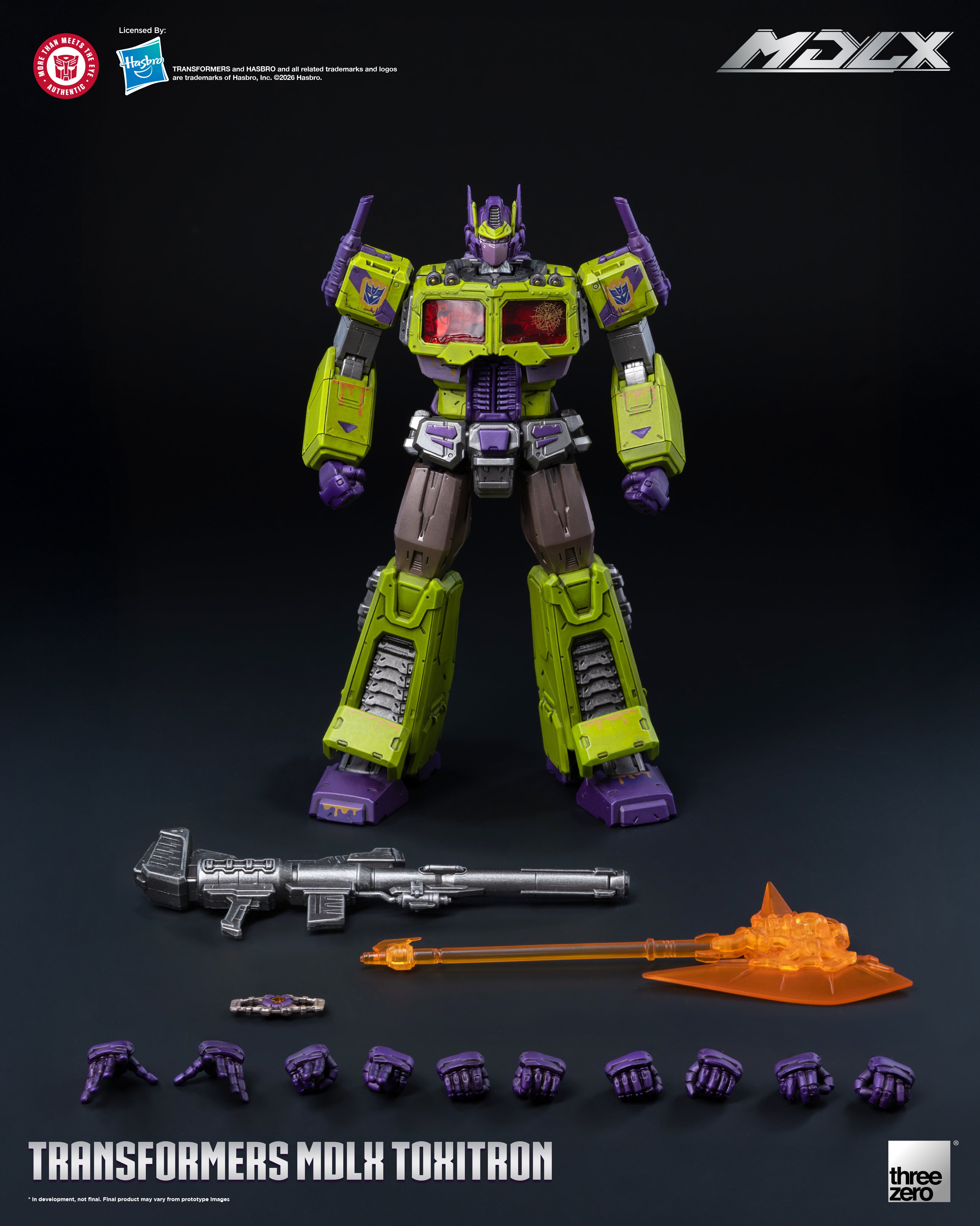 MDLX Toxitron is equipped with a variety of mutated accessories including Ion Blaster, Energon Axe, Matrix, as well as six pairs of interchangeable hands.