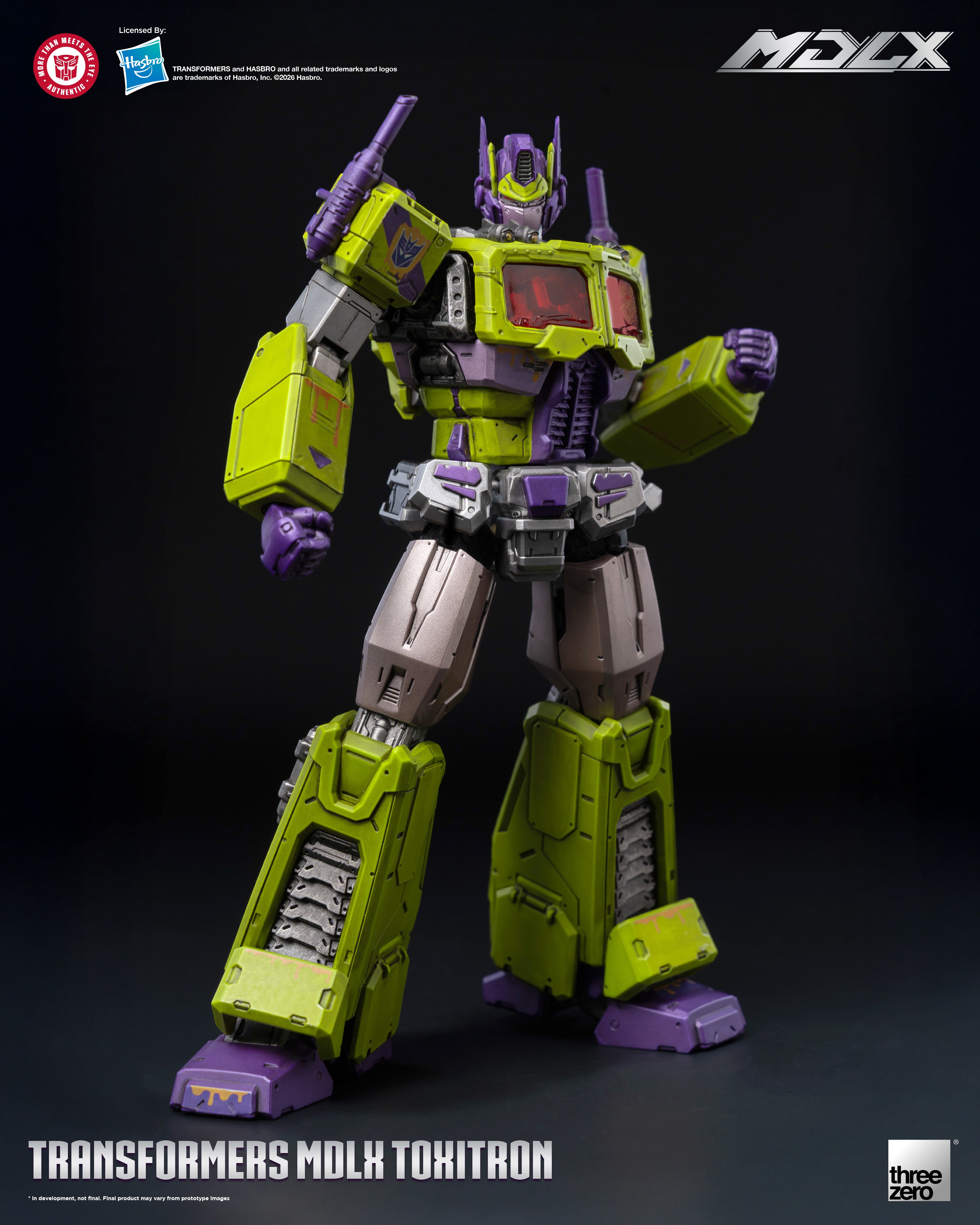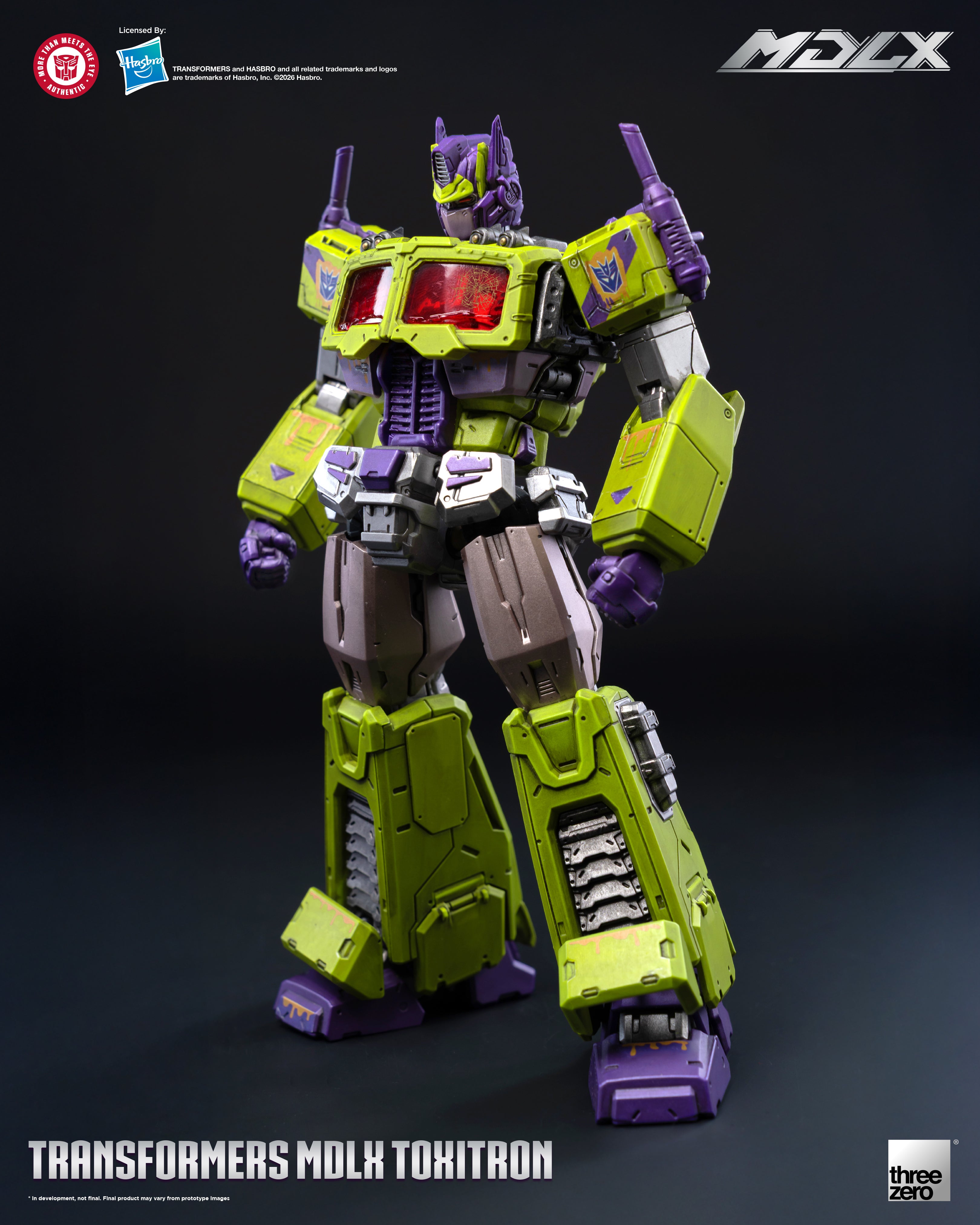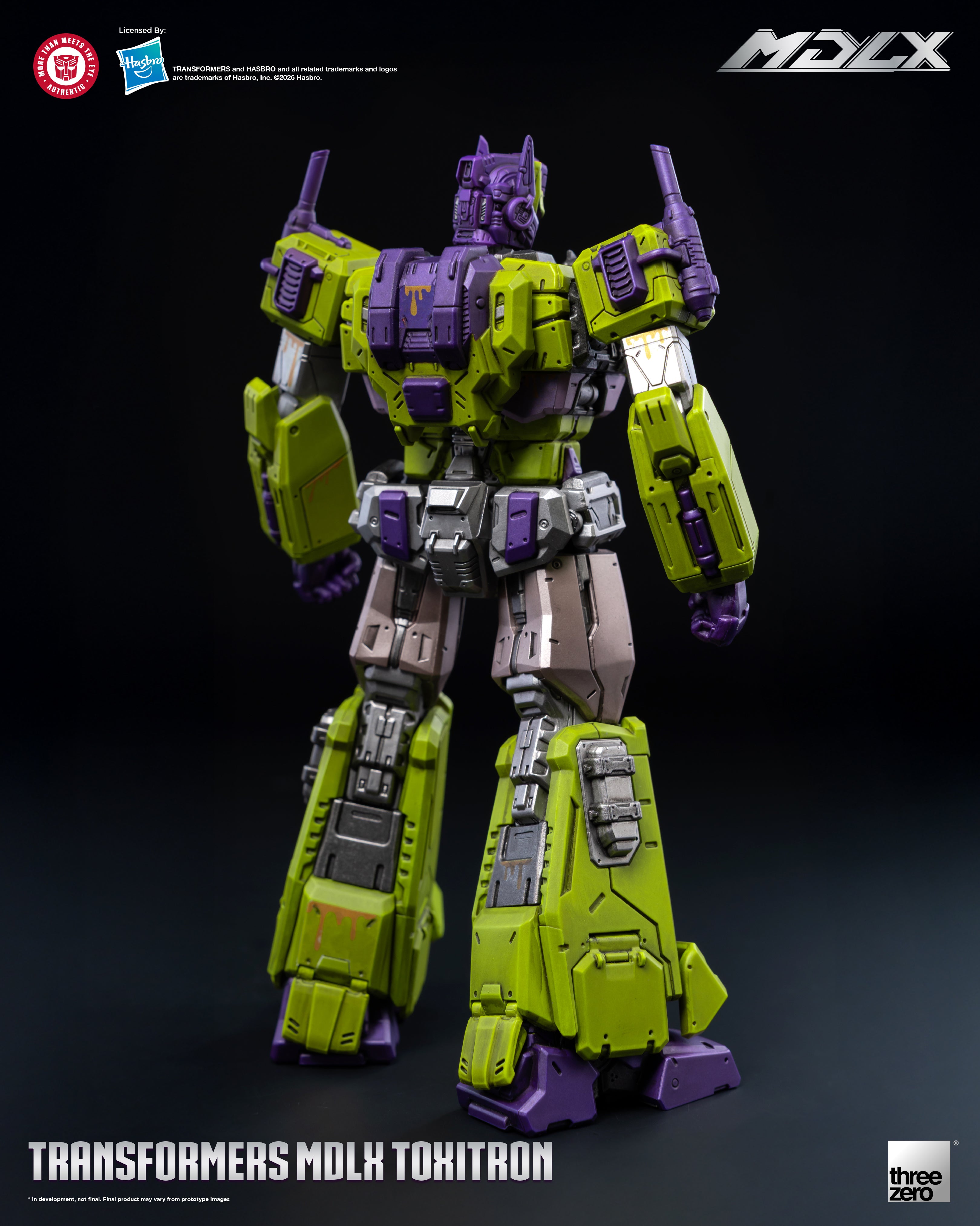 Threezero proudly present MDLX Toxitron, a monstrous abomination with the face of Optimus Prime! A failed experiment by the Decepticons to create the ultimate warrior, Toxitron oozes a corrosive slime from the seams in his armor making him a walking vat of toxic sludge.