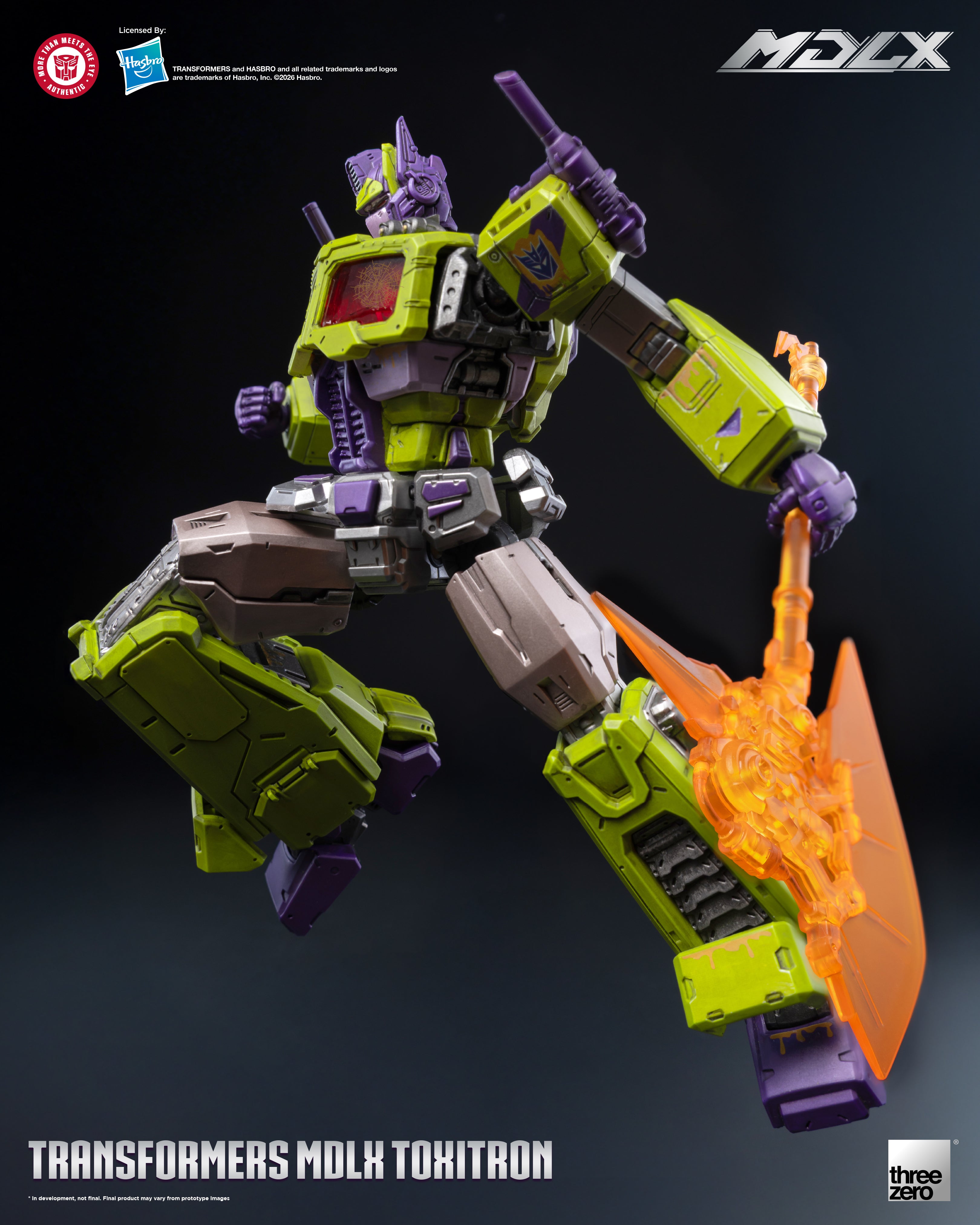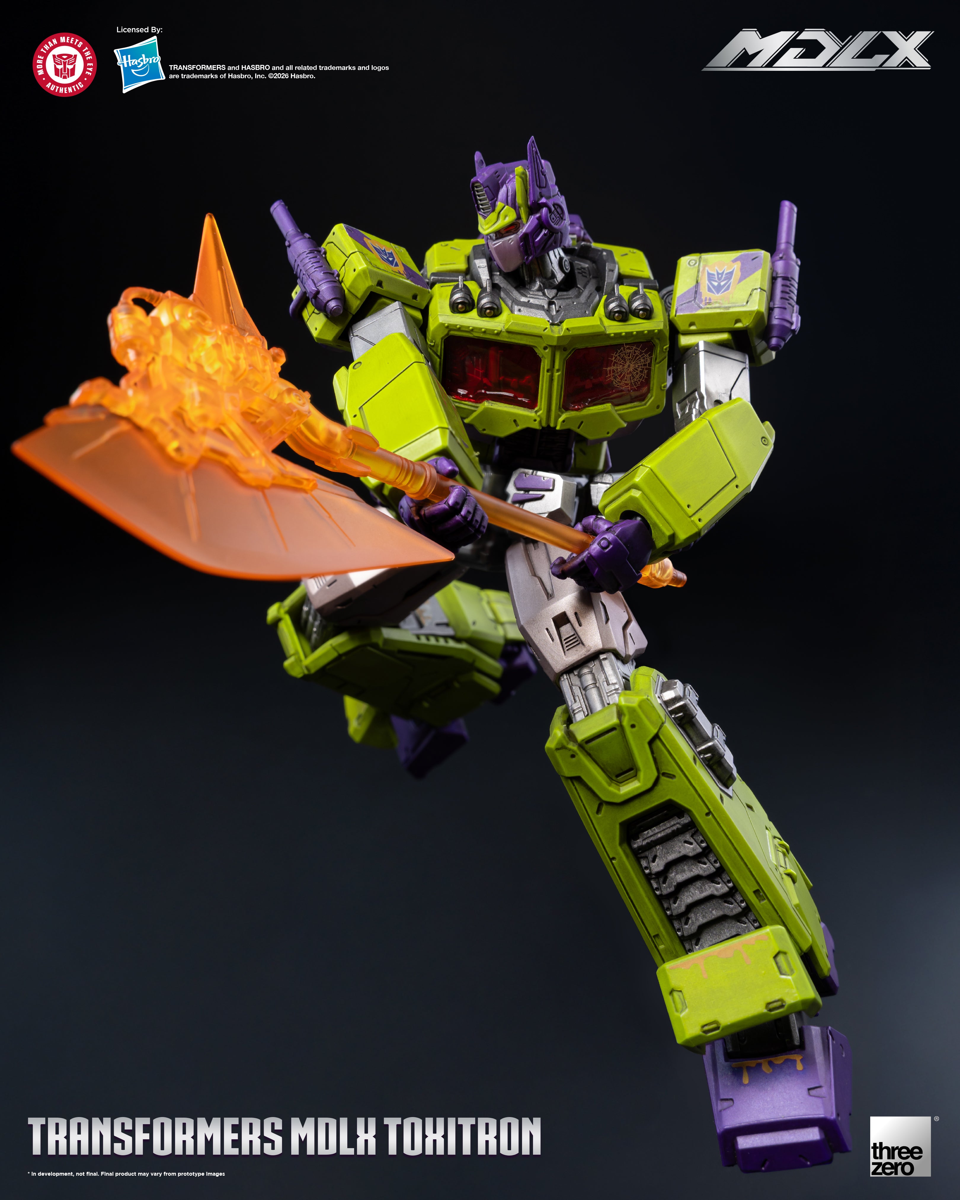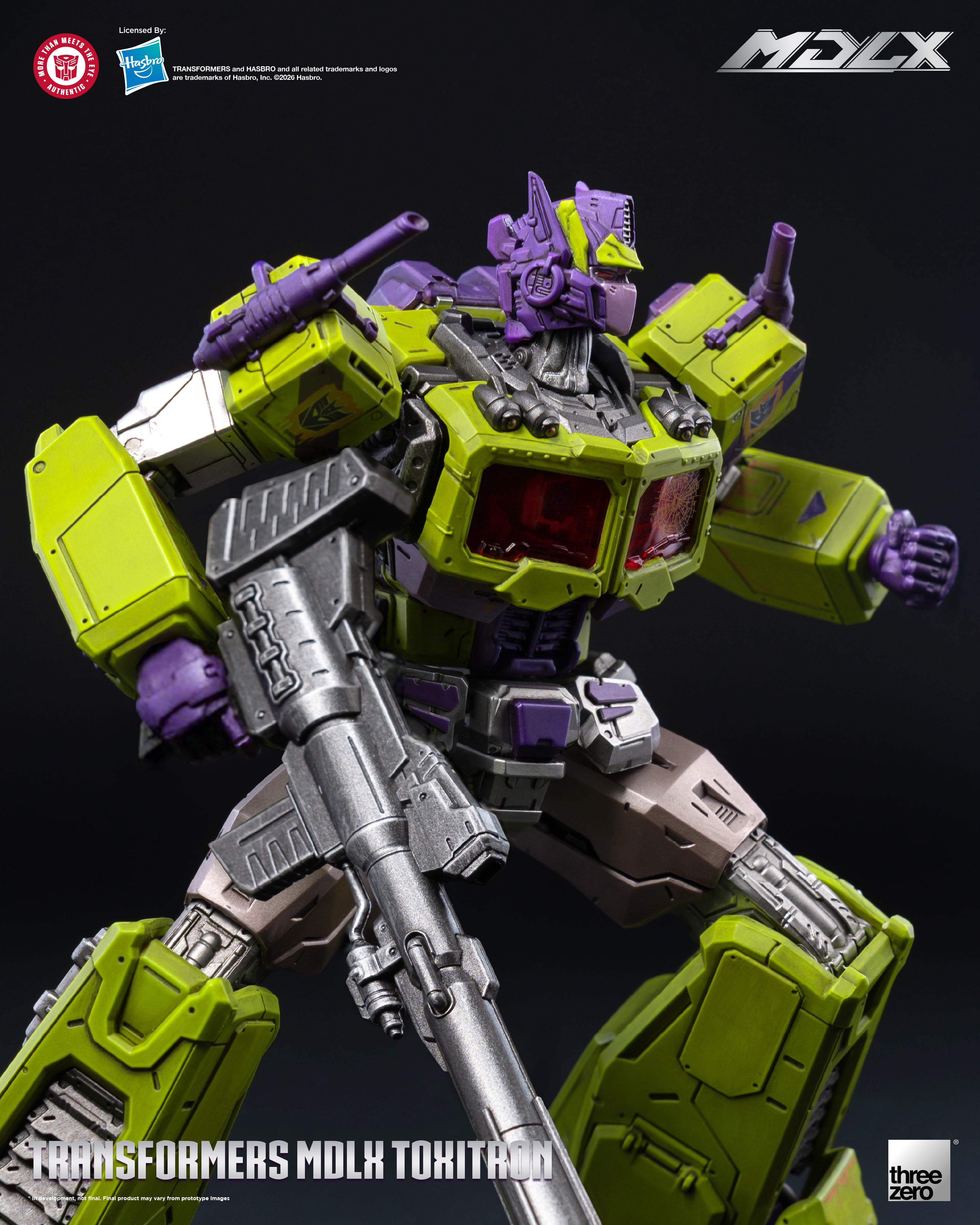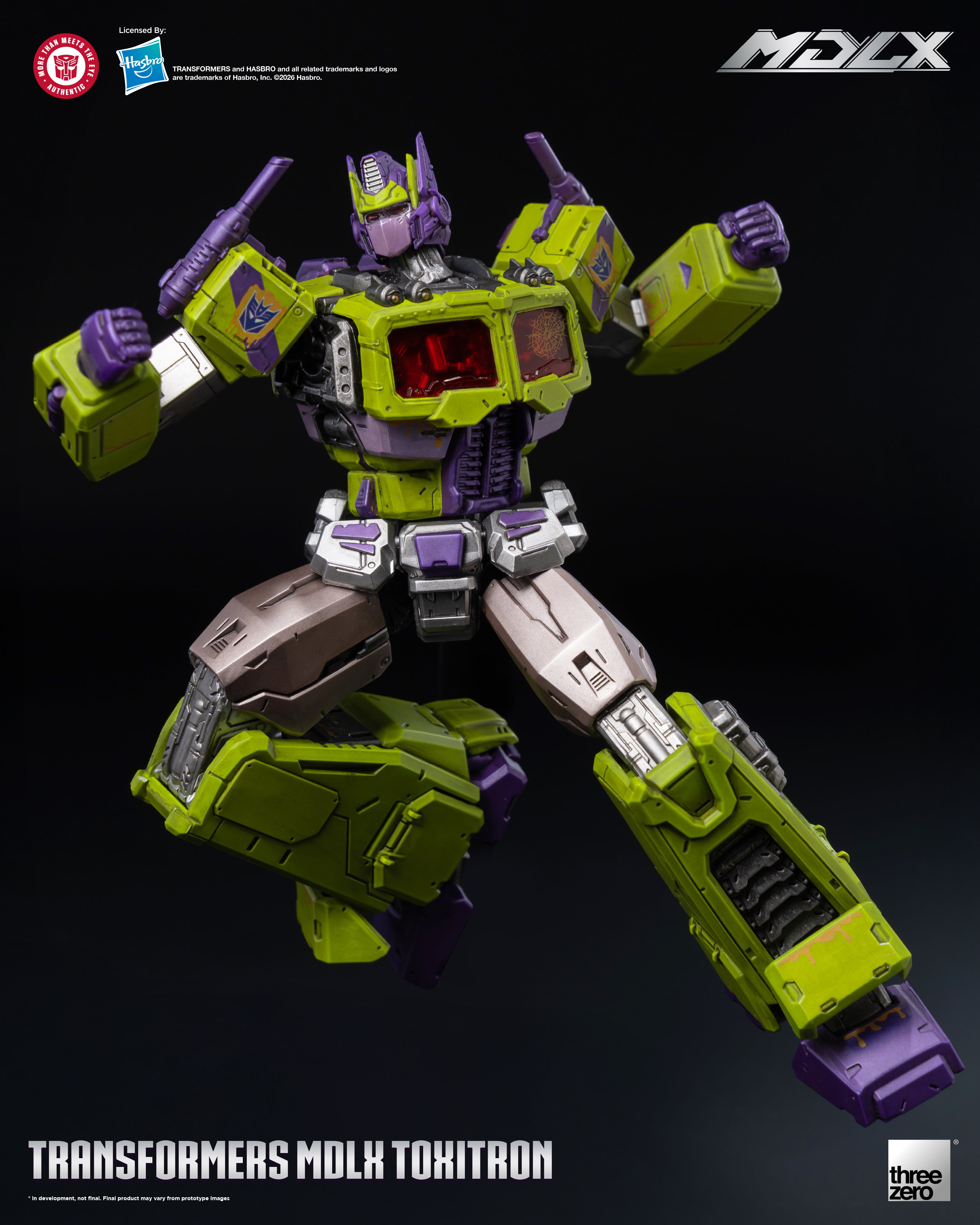 Threezero proudly present MDLX Toxitron, a monstrous abomination with the face of Optimus Prime! A failed experiment by the Decepticons to create the ultimate warrior, Toxitron oozes a corrosive slime from the seams in his armor making him a walking vat of toxic sludge.