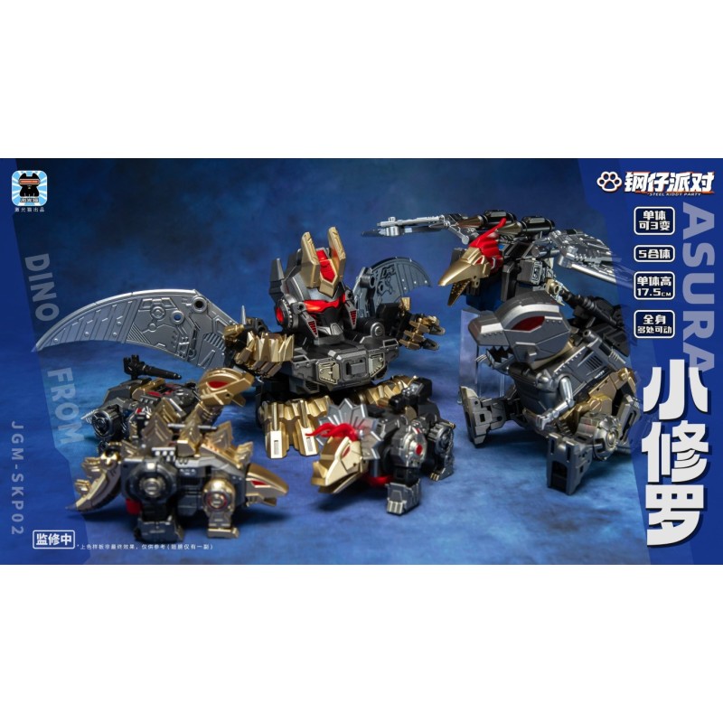From JiGuangMao Toy comes the second combiner in the Steel Kiddy Party series; JGM-SKP02 - MINI-ASURA! This set of 5 Mini Scale robots can transform from their dinosaur forms to robot modes and back, and can combine to form an even taller Combiner Robot! Individual robots stand between 2.5 to 4 inches, and Combined mode stands at around 6.5 inches!