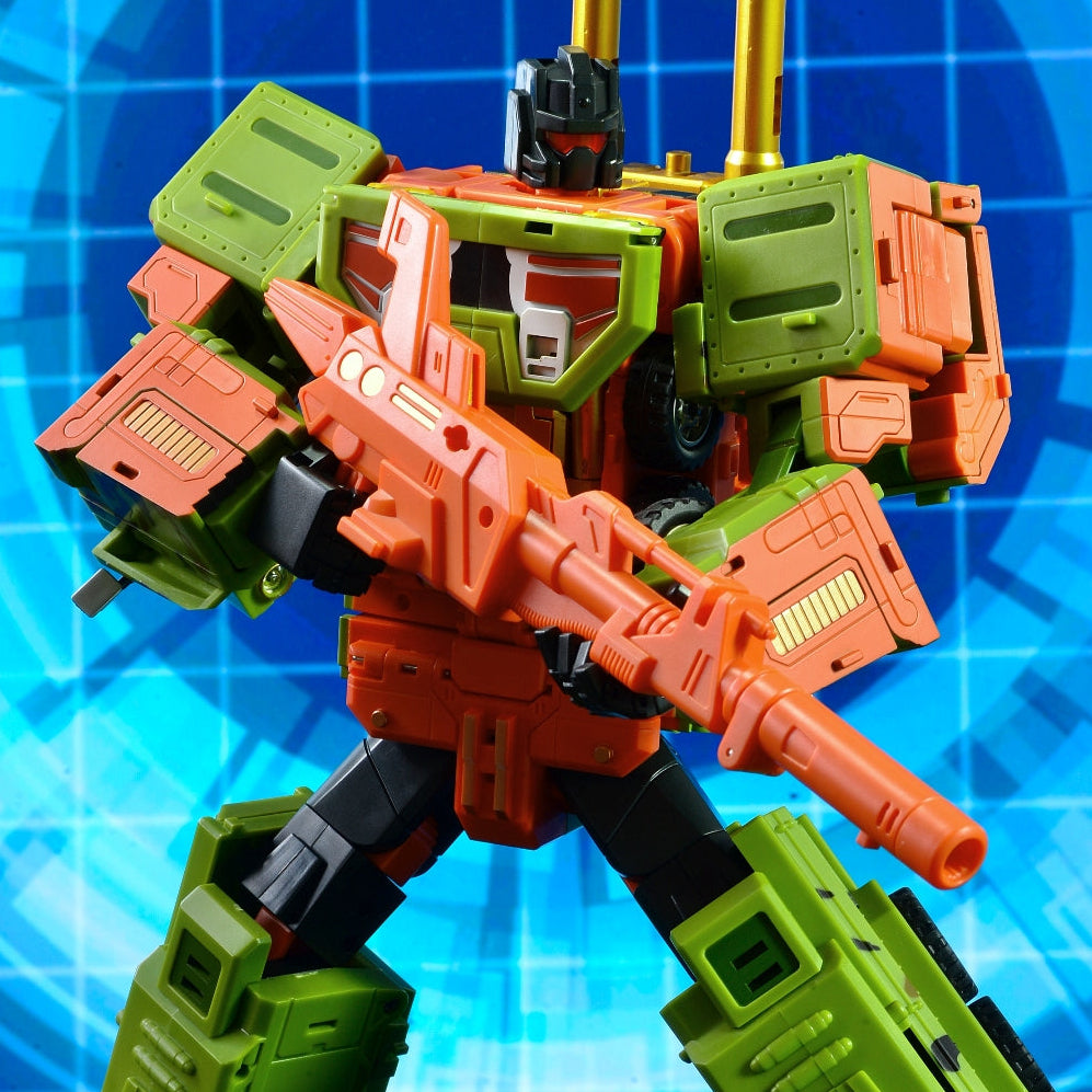 Megalith converts between robot, armored truck, and the torso of Eversus, utilizing only his own integrated components to provide full shoulder lift, ab crunch, waist swivel, and hip articulation. His weaponry adds an extra layer of power—Megalith’s gun can combine with the weapons of the other four team members to form two massive, ultimate firearms for the combiner’s use. Featuring LED light-up functions in both single and combined modes, Megalith stands an impressive 10.75 inches tall in robot form with dynamic poseability consistent with the Perfection Series standard.
