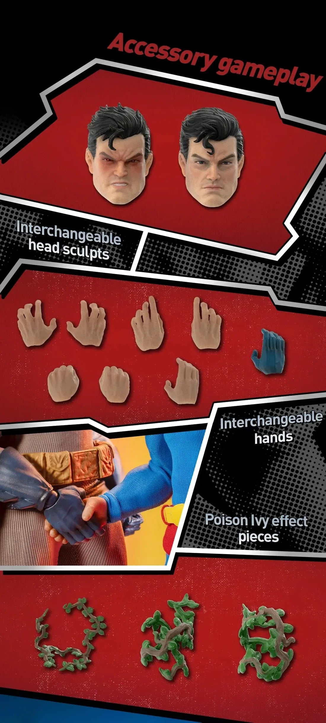 Includes: Superman figure, Interchangeable hands, Cape, & Poison Ivy vine set