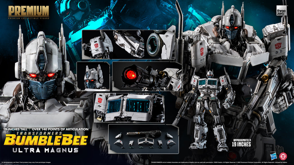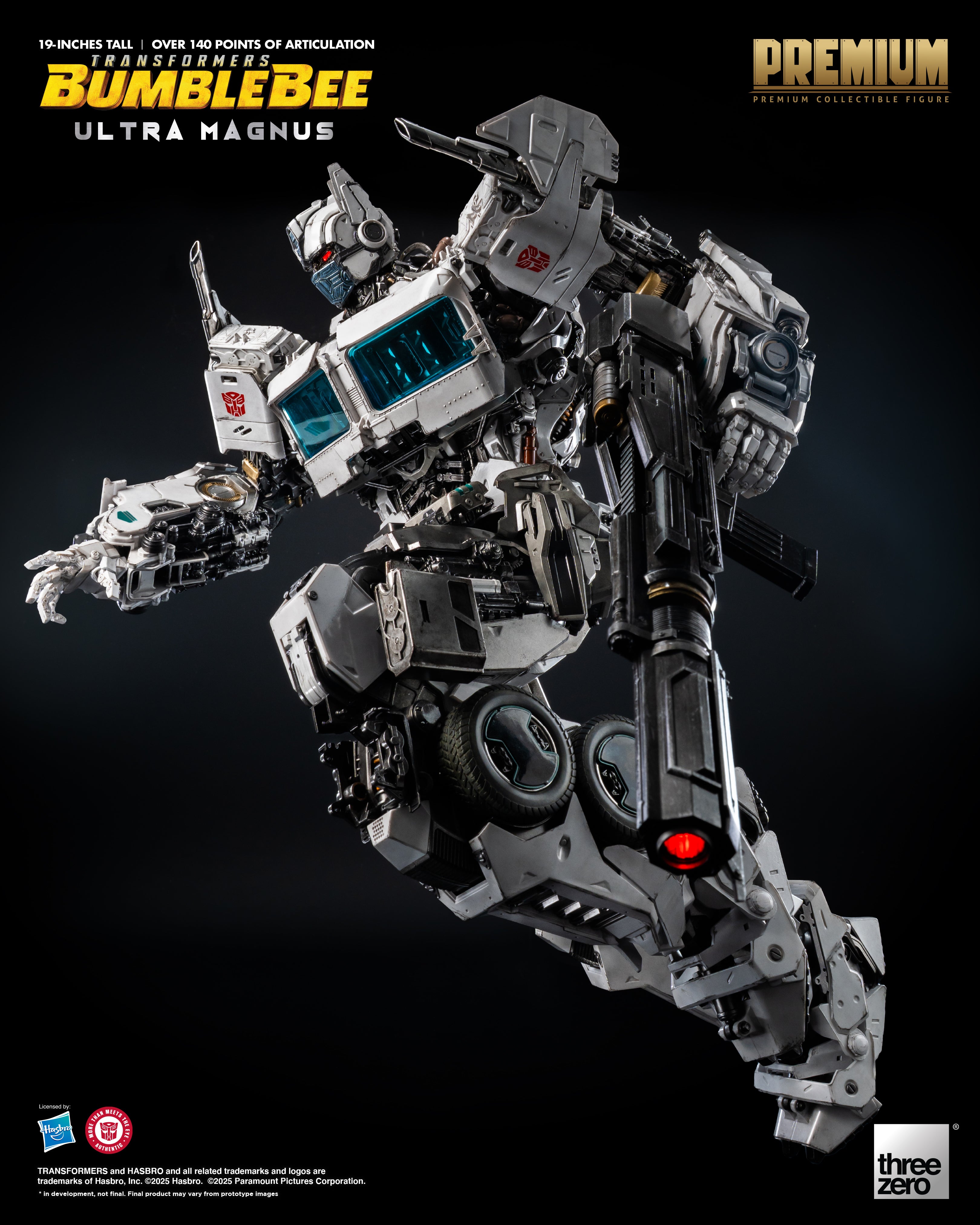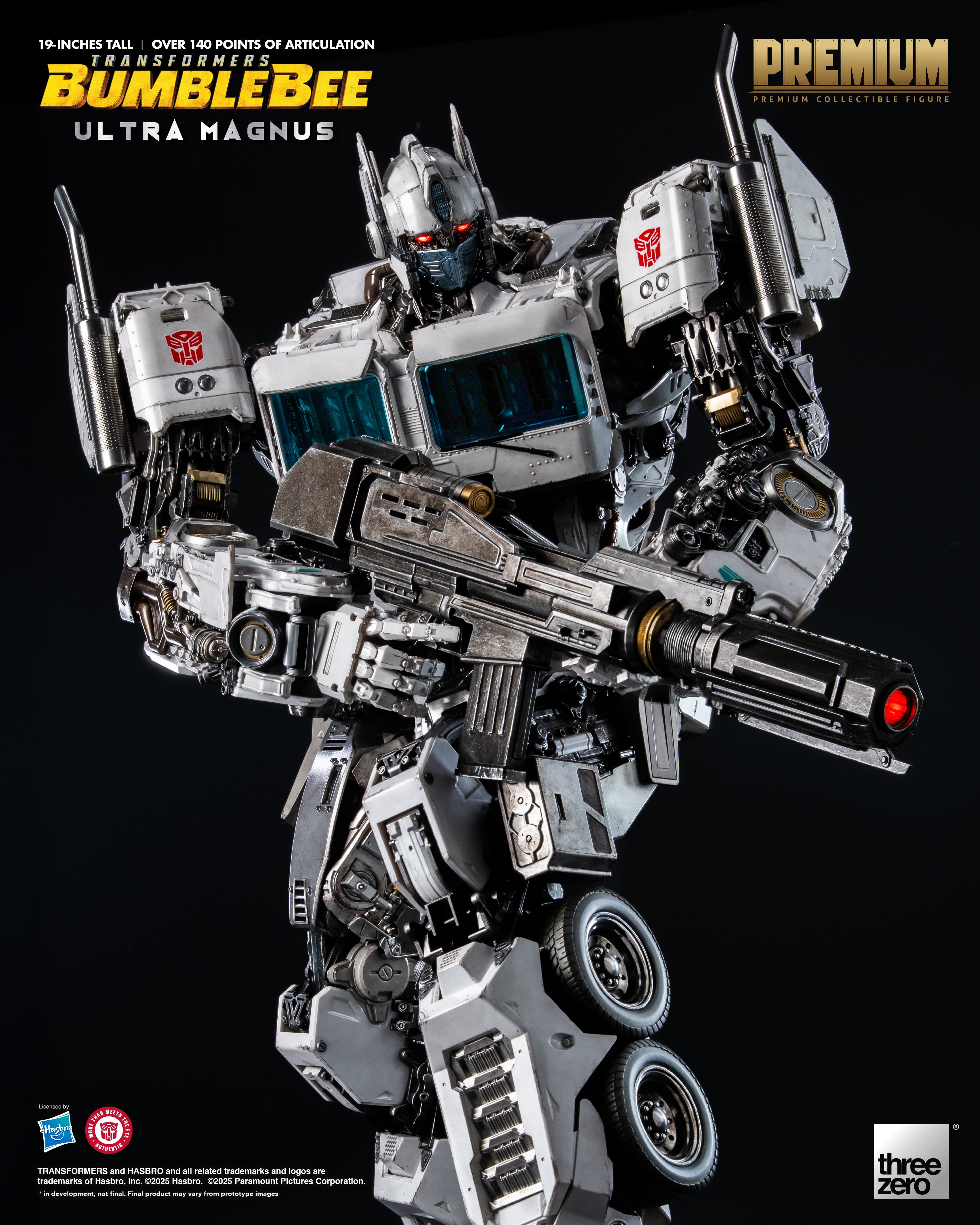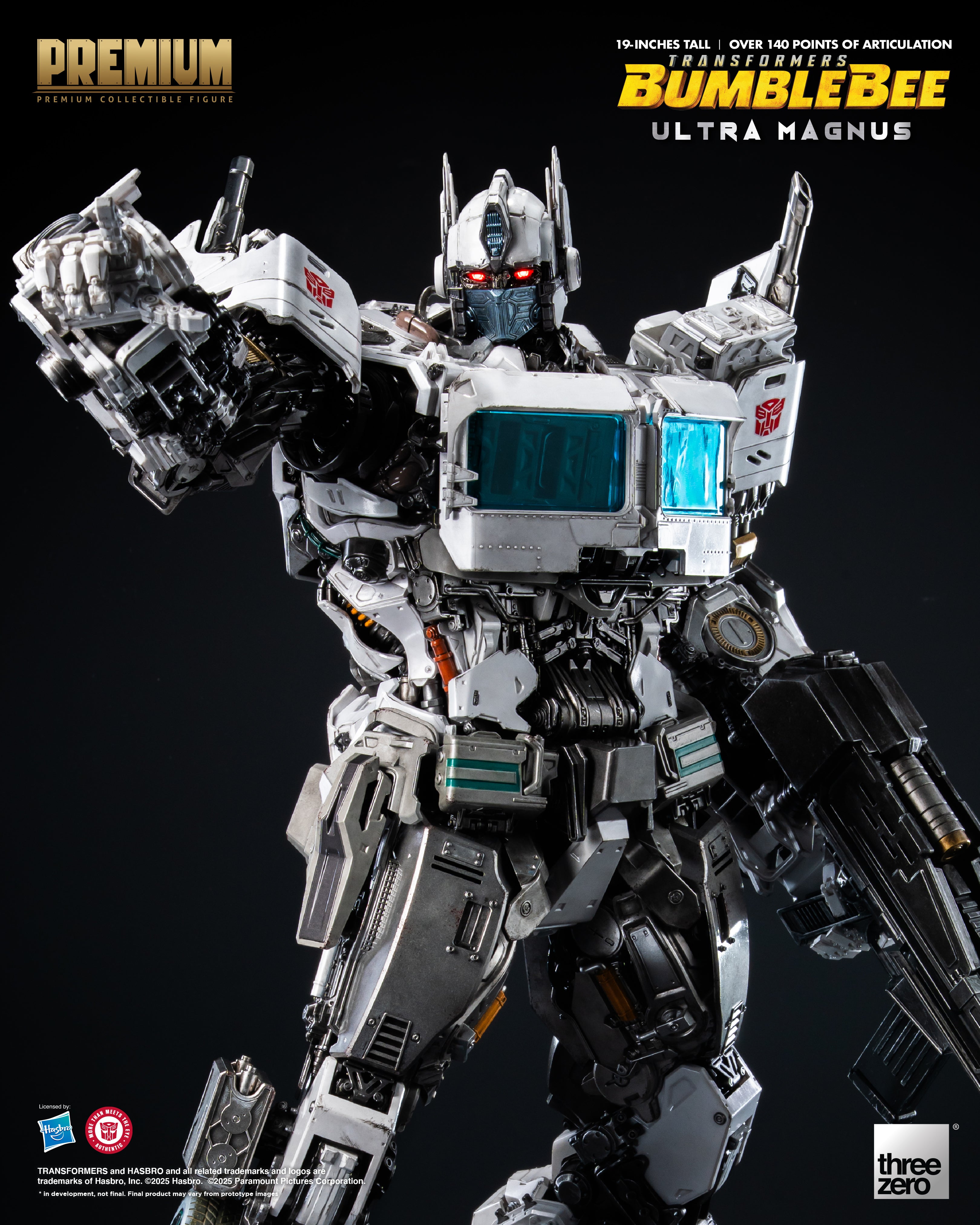 With a premium pearl white paint finish, the Transformers: Bumblebee PREMIUM Ultra Magnus stands an impressive 19 inches tall and features approximately 143 points of articulation for maximum poseability, including individually articulated fingers. The figure is built on a sturdy die-cast metal frame, providing impressive weight and a premium tactile feel. Expertly crafted with an ultra-detailed sculpt and threezero signature weathering paint, the figure cleverly combines different materials to enhance realism.