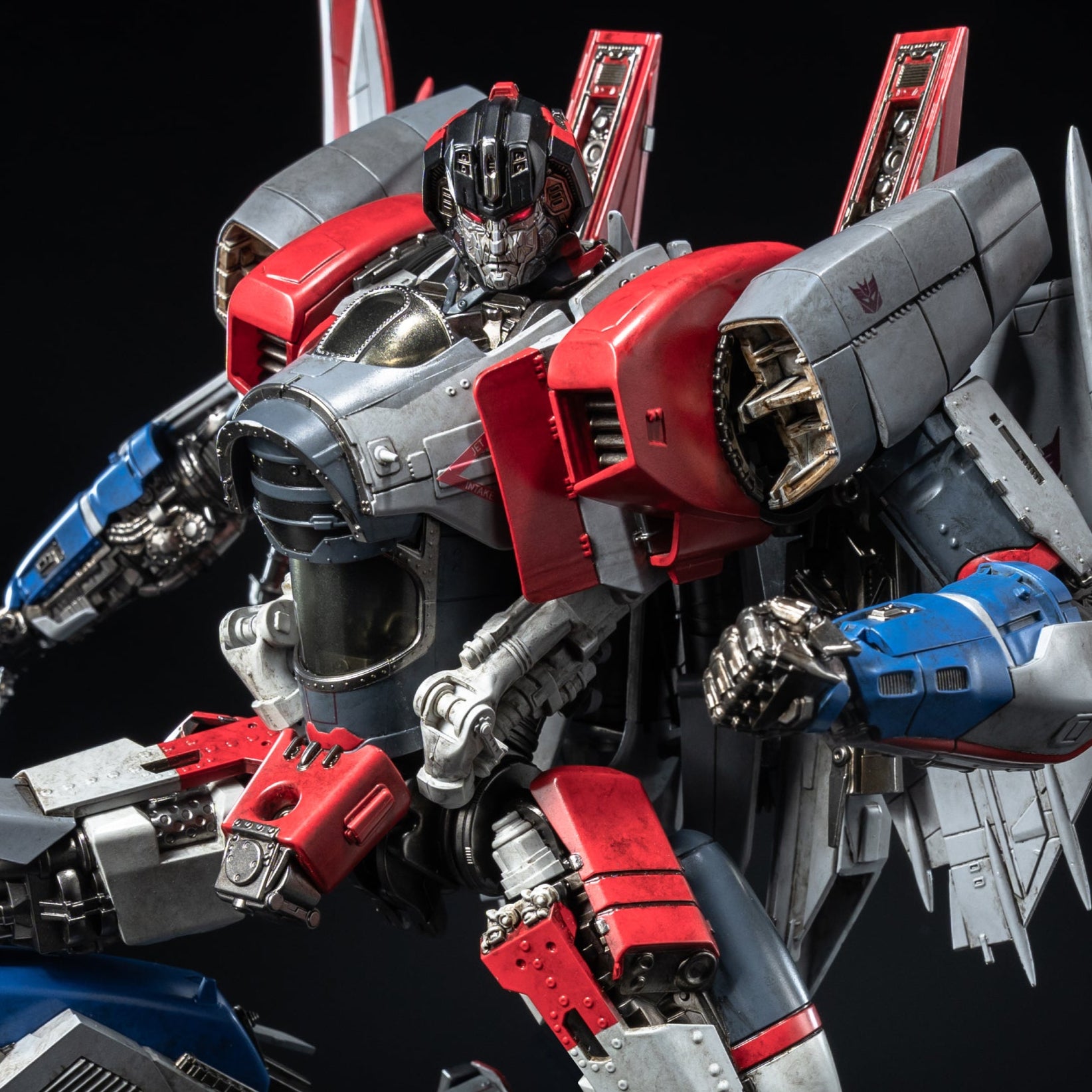 DLX Starscream stands approximately 27 cm (10.6 inches) tall. DLX Starscream features newly sculpted parts including head, signature shoulder intakes, and other details and elements across his body, arms, and legs. He also features a magnetically controlled eye lighting system, and a die-cast alloy internal frame for enhanced durability and handling, with approximately 51 points of articulation. The knee joint structure has also been reconfigured using die-cast alloy. This allows the figure to offer excellent balance and dynamic posing, providing a premium feel. The body showcases precise, sculpted details and mechanical structures, combined with threezero's signature battle-damaged weathering techniques, which carefully reproduces mechanical abrasions for realistic textures.